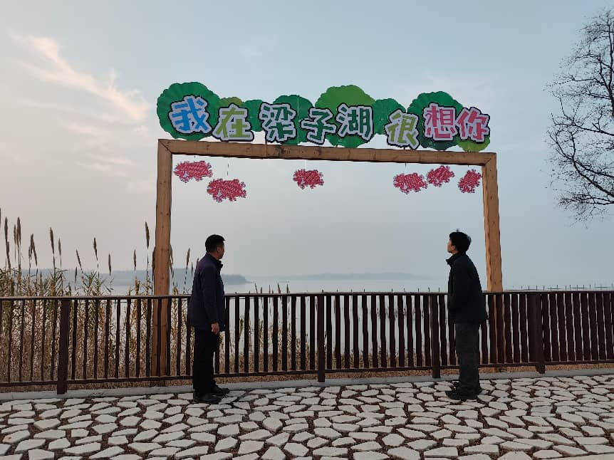 贺海明跟随吴书记在环湖路实地勘察生态资源规划红色步道(右一)